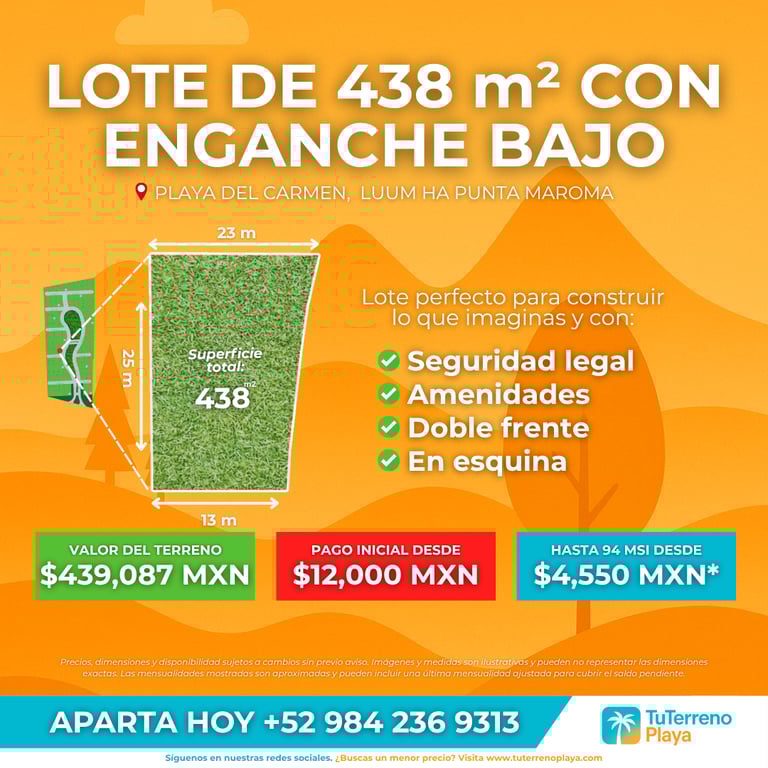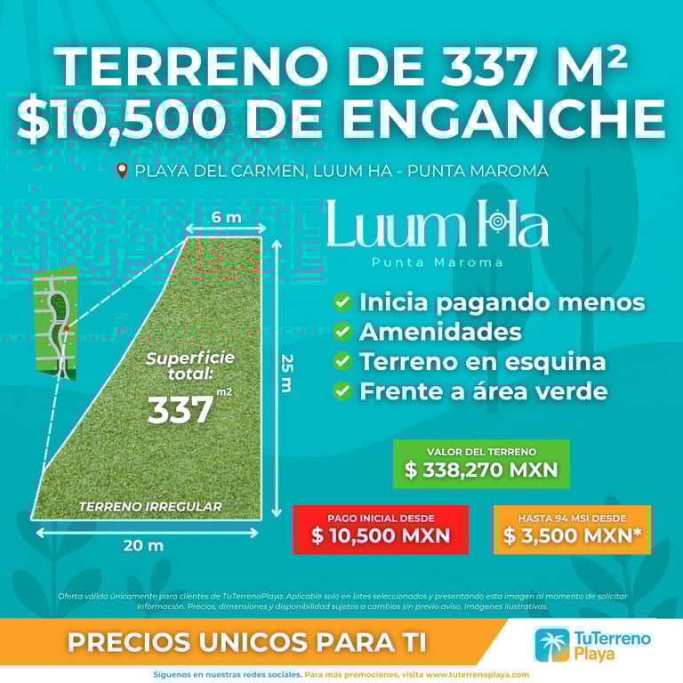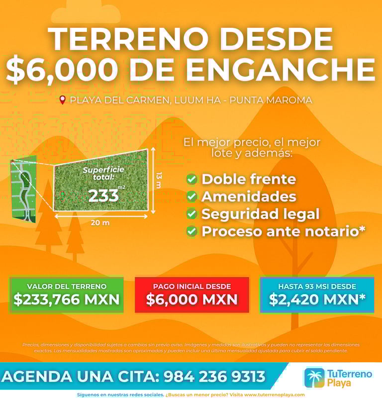 La información mostrada en este sitio es únicamente de carácter informativo. Los precios, promociones, disponibilidad y condiciones de financiamiento dependen directamente de cada desarrollo y pueden cambiar sin previo aviso. Tú Terreno Playa no realiza cobros ni gestiona pagos a nombre de los desarrollos. Para detalles precisos y actualizados, consulta con un asesor certificado.